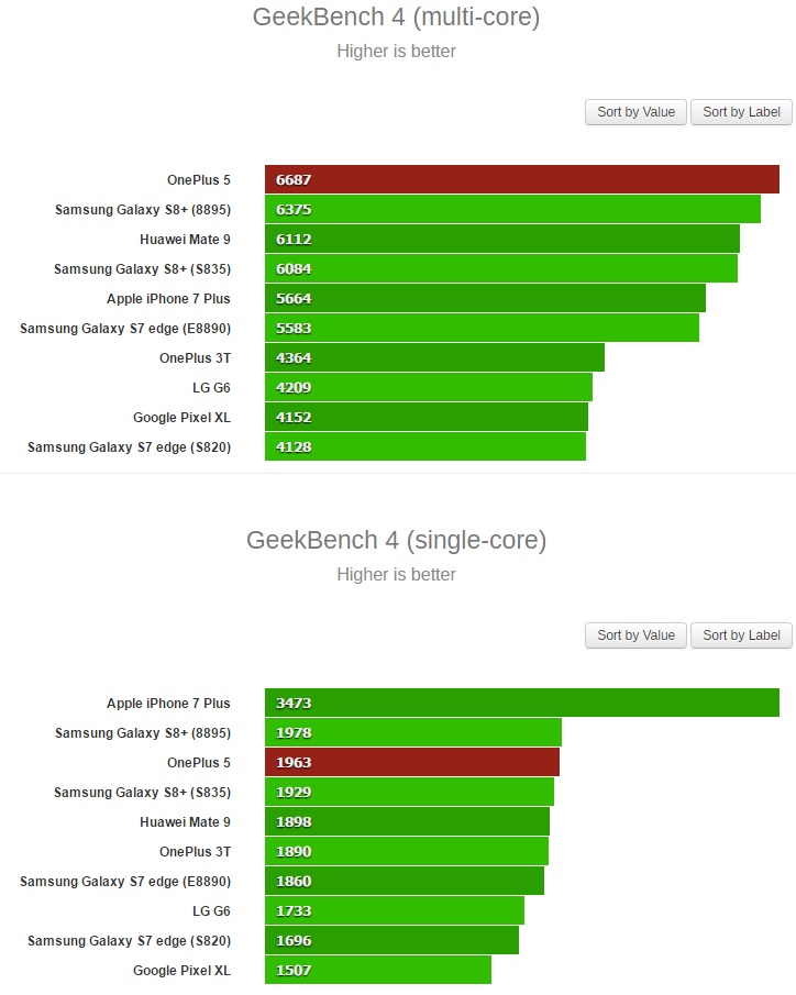 “Φορώντας” το Snapdragon 835, το OnePlus 5 δε θα περίμενε κανείς να διαφέρει ιδιαίτερα από άλλες συσκευές που το ενσωματώνουν, όπως τα Galaxy S8 και Xperia XZ Premium. Αυτό επαληθεύεται στο single-core test, όπου πετυχαίνει 1.963 βαθμούς, ελαφρώς περισσότερους από του Qualcomm-based S8+ και ελαφρώς λιγότερους από την έκδοση με το Exynos 8895 (που πωλείται στην Ελλάδα). Ωστόσο, η κατάσταση αλλάζει σημαντικά στο multi-core test, καθώς το OnePlus 5 επιτυγχάνει 6.687 βαθμούς, 10% περισσότερους από του S8+ με το 835 και 5% περισσότερους από του S8+ με το Exynos! Φυσικά αφήνει πολύ πίσω του και το iPhone 7 Plus, αν και η ναυαρχίδα της Apple παραμένει μακράν κυρίαρχη στα single-core tests, με σημαντικές υψηλότερη βαθμολογία που τα Android phones θα κάνουν… χρόνια να αγγίξουν.