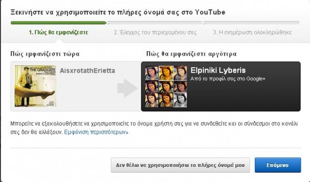 Ενώ οι περισσότεροι από εμάς χρησιμοποιούμε εδώ και χρόνια το YouTube, διαθέτοντας κανάλι, αλλά και επισημαίνοντας βίντεο ως αγαπημένα, φτιάξαμε τους λογαριασμούς μας πολύ πριν χρησιμοποιηθεί «αυστηρή» πολιτική ονομάτων από την Google. Έτσι, πολλοί, στο YouTube χρησιμοποιούν ψευδώνυμα. Με την έλευση του Google+ και την «απαίτηση» από το κοινωνικό δίκτυο να χρησιμοποιεί καθένας στην εγγραφή του το πραγματικό του όνομα, οι περισσότεροι, έβαλαν στο προφίλ τους το κανονικό τους όνομα, ενώ στο YouTube, εξακολουθούσαν και χρησιμοποιούσαν ψευδώνυμο.