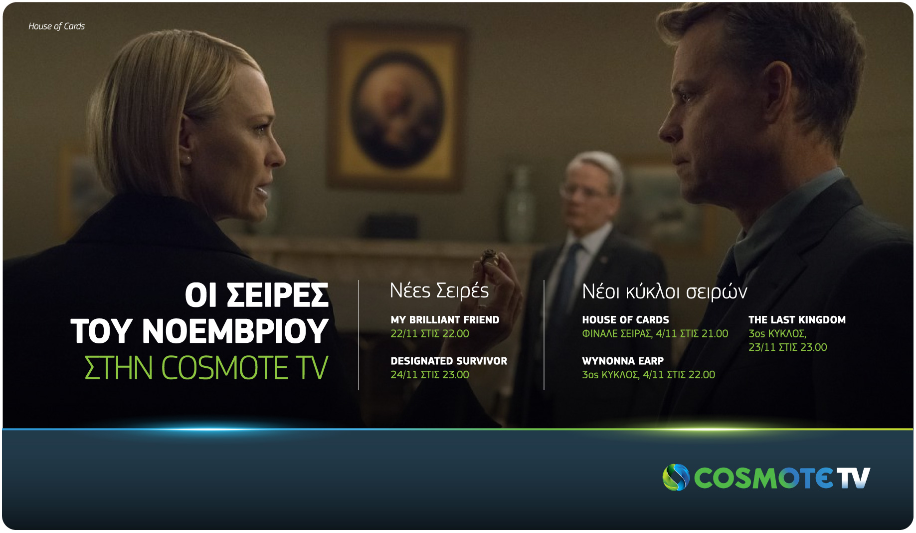 Το πολυαναμενόμενο φινάλε του House of Cards, η νέα, βασισμένη στο ομώνυμο best seller ιταλική σειρά My Brilliant Friend, που πρωτοπαρουσιάστηκε στο φετινό φεστιβάλ Βενετίας, οι νέοι κύκλοι των δημοφιλών The Last Kingdom και Wynonna Earp, είναι κάποιες από τις πρεμιέρες σειρών του Νοεμβρίου στην COSMOTE TV. Αμέσως μετά την προβολή τους στο κανάλι COSMOTE CINEMA 4HD, τα επεισόδια των σειρών θα είναι διαθέσιμα στην υπηρεσία COSMOTE TV PLUS.
