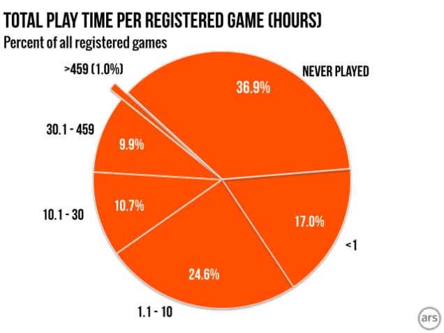 Τώρα, ένα άλλο πολύ ενδιαφέρον στοιχείο αφορά τις ώρες που έχουν γράψει οι παίκτες παίζοντας τα παιχνίδια που έχουν στις συλλογές τους. Πολλοί ισχυρίζονται ότι οι χρήστες του Steam αγοράζουν επειδή βρίσκουν προσφορές και όχι επειδή παίζουν. Το γράφημα που ακολουθεί τα λέει όλα –κι ας είναι στα αγγλικά: