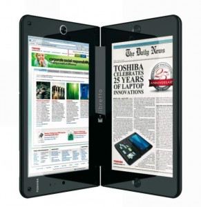 Η πρώτη αντίδρασή μας ήταν να τρίψουμε τα μάτια μας μήπως δεν είδαμε κάτι καλά.. Κι όμως… Είναι αυτό ακριβώς που βλέπουμε. Το πρώτο laptop διπλής οθόνης με Windows 7 στον κόσμο. Το team της Toshiba φαίνεται πως κάνει θαύματα, δίνοντας στον όρο “καινοτομία” την έννοια που του ταιριάζει. Το Libretto W100 αποτελεί μία συλλεκτική έκδοση της εταιρείας που θα κυκλοφορήσει το τρίτο τρίμηνο του έτους σε Ευρώπη, Μέση Ανατολή και Αφρική. Με δύο οθόνες αφής 7 ιντσών αποτελεί μία ξεχωριστή πρόταση για κάθε ψαγμένο χρήστη. Μπορείτε να το κρατήσετε κάθετα (σαν ένα βιβλίο) και να διαβάσετε ένα σαλόνι περιοδικού ή εφημερίδας, σαν να είχατε μπροστά σας την έντυπη έκδοση. Μπορείτε ακόμη να το τοποθετήσετε και οριζόντια (σαν ένα κανονικό laptop) με την κάτω οθόνη να λειτουργεί ως εικονικό πληκτρολόγιο ή απλά ως συνοδευτική οθόνη για να κρατάτε σημειώσεις σχετικά με την εργασία που κάνετε στο πάνω μέρος. Το πιο εντυπωσιακό όλων είναι ότι μπορείτε να σύρετε αρχεία, εικονίδια και λοιπό περιεχόμενο από τη μία οθόνη στην άλλη, με μία απλή κίνηση του δαχτύλου σας! Το Libretto είναι μικρότερο και ελαφρύτερο από ένα netbook, επομένως μπορείτε να το μεταφέρετε εύκολα μαζί σας παντού. Χμμ… Μετά από όλα αυτά, μήπως το iPad πρέπει να αρχίσει να ανησυχεί;