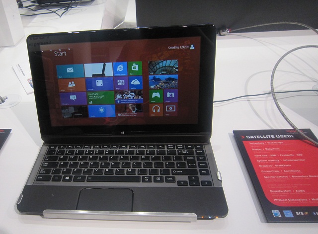 Το Satellite U920t είναι, λοιπόν, η πρόταση της Toshiba στις υβριδικές συσκευές. Διαθέτει μία οθόνη 12,5 ιντσών –αρκετά μεγάλη θα λέγαμε σε σχέση με τις υπόλοιπες προτάσεις που είδαμε- TruBrite Touch iPS HD, σκληρό δίσκο SSD χωρητικότητας έως 256GB, μνήμη DDR3 έως τα 8GB, κάρτα γραφικών Intel HD Graphics 4000, 2 USB3.0, υποστήριξη Intel Wireless Display (WiDi), καθώς και αισθητήρες φωτός, γυροσκόπιο και μαγνητόμετρο, ενώ να σημειώσουμε ότι το βάρος του φτάνει το 1.45 κιλό. Τέλος, αναμένεται να κυκλοφορήσει μετά την κυκλοφορία των Windows 8 στις 26 Οκτωβρίου σε τιμή που θα προσεγγίζει τα 1000 ευρώ.