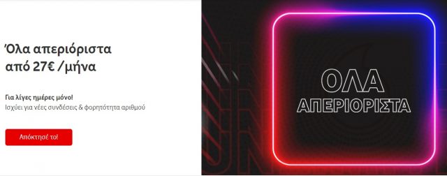Στους τακτικούς ελέγχους μας στα sites των παρόχων κινητής εντοπίσαμε μια νέα προσφορά της Vodafone που υπόσχεται απεριόριστα… τα πάντα (data, ομιλία, SMS) με €27 το μήνα.