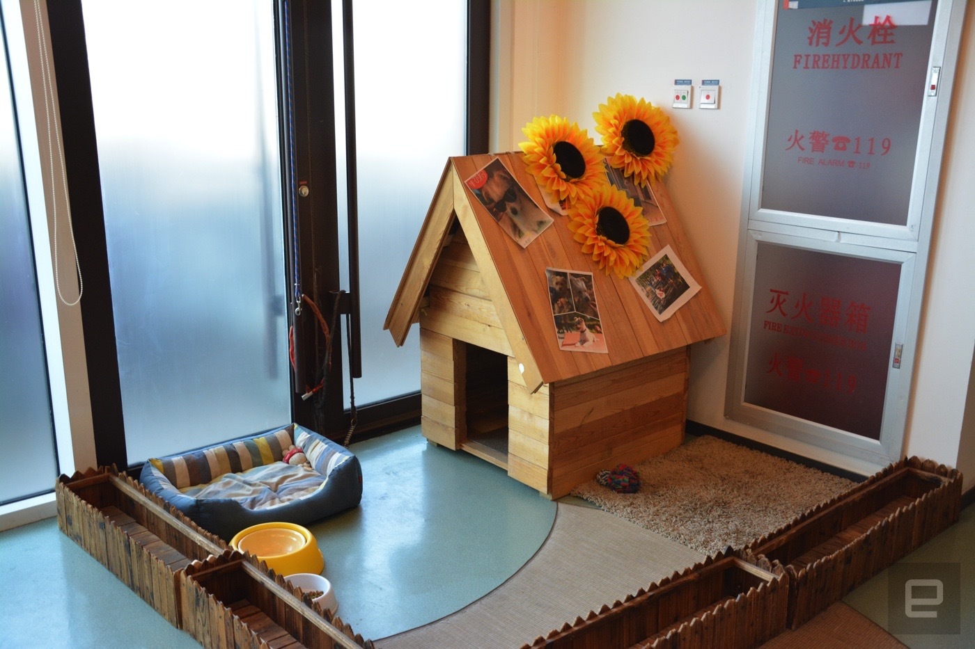 …το σπιτάκι του αδέσποτου σκύλου που έχουν υιοθετήσει από την εταιρεία καθώς βρέθηκε κατά την κατασκευή του κτιρίου…