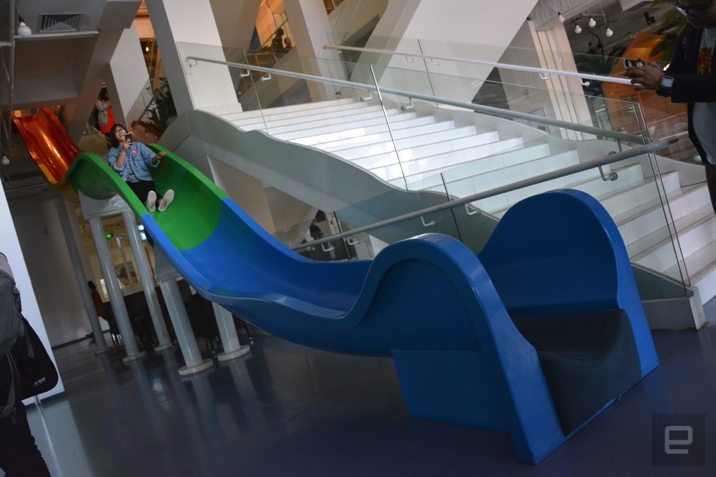 …αλλά και την τσουλήθρα που έχει εγκατασταθεί μέσα στο κτίριο για πιο γρήγορη είσοδο, εμπνευσμένη από την… Google.