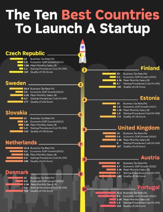 Η Τσεχία αναδείχθηκε ως η καλύτερη χώρα για την έναρξη μιας startup το 2023. Με το κόστος για την εκκίνηση μιας startup να αντιστοιχεί στο 1,1% του κατά κεφαλήν ΑΕΠ, η Τσεχία θεωρείται ένα από τα φθηνότερα μέρη στον κόσμο, για να ξεκινήσει κανείς μια startup. Σύμφωνα με την έρευνα, το κόστος εργασίας είναι επίσης λογικό, με μισθούς κατά μέσο όρο $1.800 τον μήνα. Η Φινλανδία αναδείχθηκε η δεύτερη καλύτερη χώρα για startups στον κόσμο για το 2023. Οι επιχειρήσεις φορολογούνται με 20% και η έναρξη λειτουργίας μιας εταιρείας (διαδικασίες εκκίνησης) αντιστοιχεί μόλις στο 0,7% του κατά κεφαλήν ΑΕΠ.