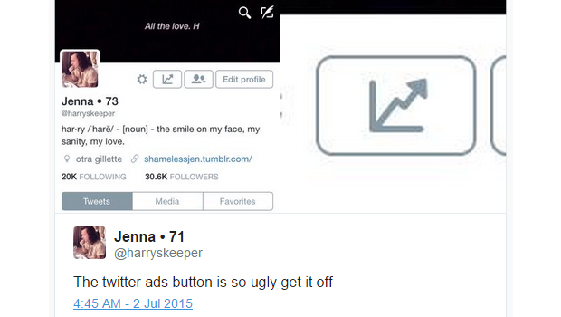 Αρκετοί χρήστες εντόπισαν στο προφίλ τους στο Twitter για Android και iOS συσκευές την προσθήκη ενός νέου εικονιδίου, μεταξύ του γρύλλου που παραπέμπει στα settings και του εικονιδίου που δίνει την δυνατότητα αλλαγής λογαριασμού. Το νέο εικονίδιο, εν ονόματι Twitter Ads button, όπου έχει την μορφή ενός βέλους και θα μπορούσε κανείς να πει ότι παραπέμπει στα Analytics του κοινωνικού δικτύου, δίνει την δυνατότητα σε εκείνους τους χρήστες που «τρέχουν» διαφημιστικές καμπάνιες, να τις διαχειριστούν.