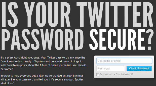 Λόγω του πρόσφατος γεγονότος, όπου η παραβίαση ενός Twitter λογαριασμού και η δημοσίευση ενός κρίσιμου Tweet(!) είχε φοβερές συνέπειες ώστε να πέσει ο Dow Jones περίπου 150 μονάδες, ο Alastair Coote αποφάσισε να δημιουργήσει ένα site. Στο site αυτό οι χρήστες με Twitter λογαριασμό μπορούν να ελέγξουν μέσα από έναν αλγόριθμο πόσο ασφαλής είναι ο κωδικός τους. Για δοκιμάστε το.