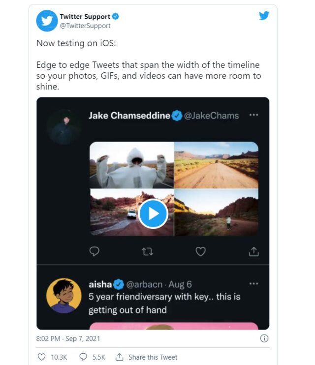 Όπως έγινε ήδη γνωστό, με μια νέα λειτουργία στο Twitter, τα οπτικά μέσα που ενσωματώνονται στα tweet, θα καλύπτουν όλο το πλάτος της οθόνης ενός κινητού τηλεφώνου. Η νέα εμφάνιση, δοκιμάζεται προς το παρόν σε κινητά με την τεχνολογία iOS, όχι όμως σε Android. Σύμφωνα με το Twitter, οι μεγαλύτερες φωτογραφίες στις αναρτήσεις “θα δώσουν στα μέσα ενημέρωσης περισσότερο χώρο για να λάμψουν».