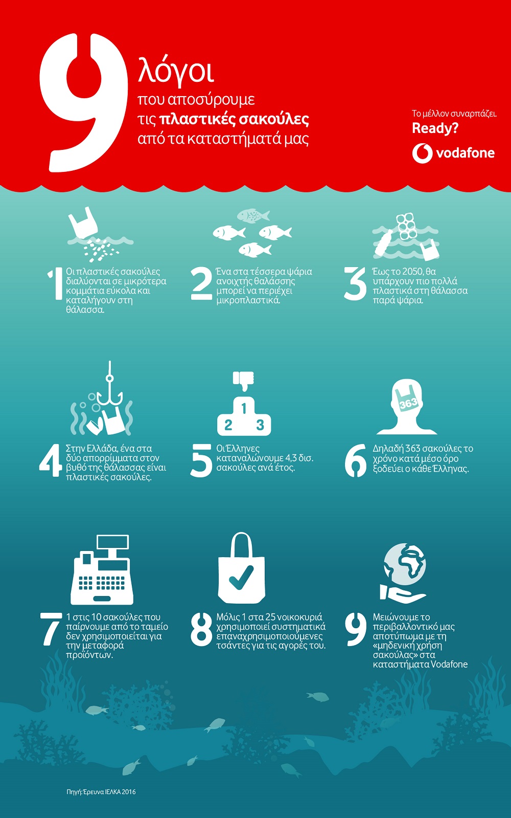 Σύμφωνα με αυτόν το στόχο και με αφορμή την Ευρωπαϊκή οδηγία για τη μείωση της πλαστικής σακούλας, η Vodafone απέσυρε όλες τις πλαστικές σακούλες από τα καταστήματα της εταιρείας ήδη από τον Δεκέμβριο του 2017, προχωρώντας σε πολιτική «μηδενικής χρήσης σακούλας».