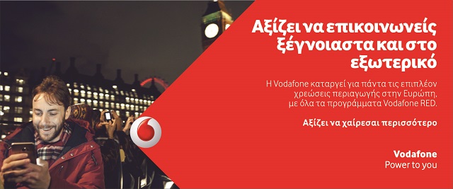 H Vodafone για πρώτη φορά στην Ελλάδα, καταργεί για πάντα τις χρεώσεις περιαγωγής σε όλα τα προγράμματα Vodafone Red, προσφέροντας τη δυνατότητα στους συνδρομητές της να χρησιμοποιούν το πρόγραμμα τους, χωρίς καμία επιπλέον χρέωση, σε όλες τις χώρες της Ευρωπαϊκής Ένωσης.