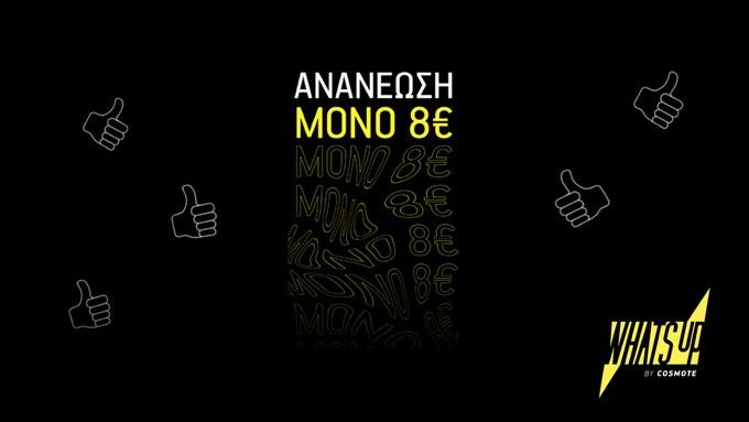 Μόλις με 8€ μπορούν πλέον να ανανεώνουν το υπόλοιπο στο καρτοκινητό τους οι χρήστες του WHAT’S UP, ενώ παράλληλα με την χαμηλή αυτή ανανέωση υπολοίπου, μπορούν όσοι επιθυμούν βασική χρήση να ενεργοποιούν το νέο συνδυαστικό πακέτο BASIC CALLS που περιλαμβάνει 400’ & 40 SMS προς όλους και 400 ΜΒ. Εναλλακτικά, όσοι επιθυμούν επιπλέον data μπορούν να ενεργοποιούν τα GIGA πακέτα με απεριόριστα data για μια ημέρα, ένα σαββατοκύριακο ή 4 σαββατοκύριακα στη σειρά, μια βδομάδα ή ακόμη και τα βράδια, μόνο από 2€.
