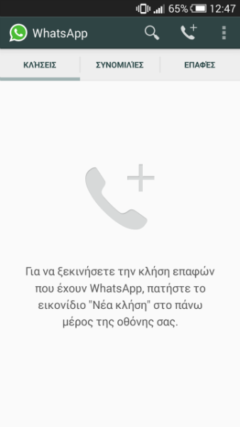 Εγκαθιστώντας την τελευταία έκδοση (2.12.5) από το Google Play ή ενημερώνοντας την εφαρμογή σας, θα δείτε το interface του WhatsApp να αποκτά τη νέα επιλογή «Κλήσεις» δίπλα από τις επιλογές «Συνομιλίες» και «Επαφές». Εκεί βρίσκεται το ιστορικό των κλήσεων, ενώ για πραγματοποίηση μιας κλήσης θα πρέπει να πατήσετε το εικονίδιο του τηλεφώνου στο πάνω δεξί μέρος της εφαρμογής.