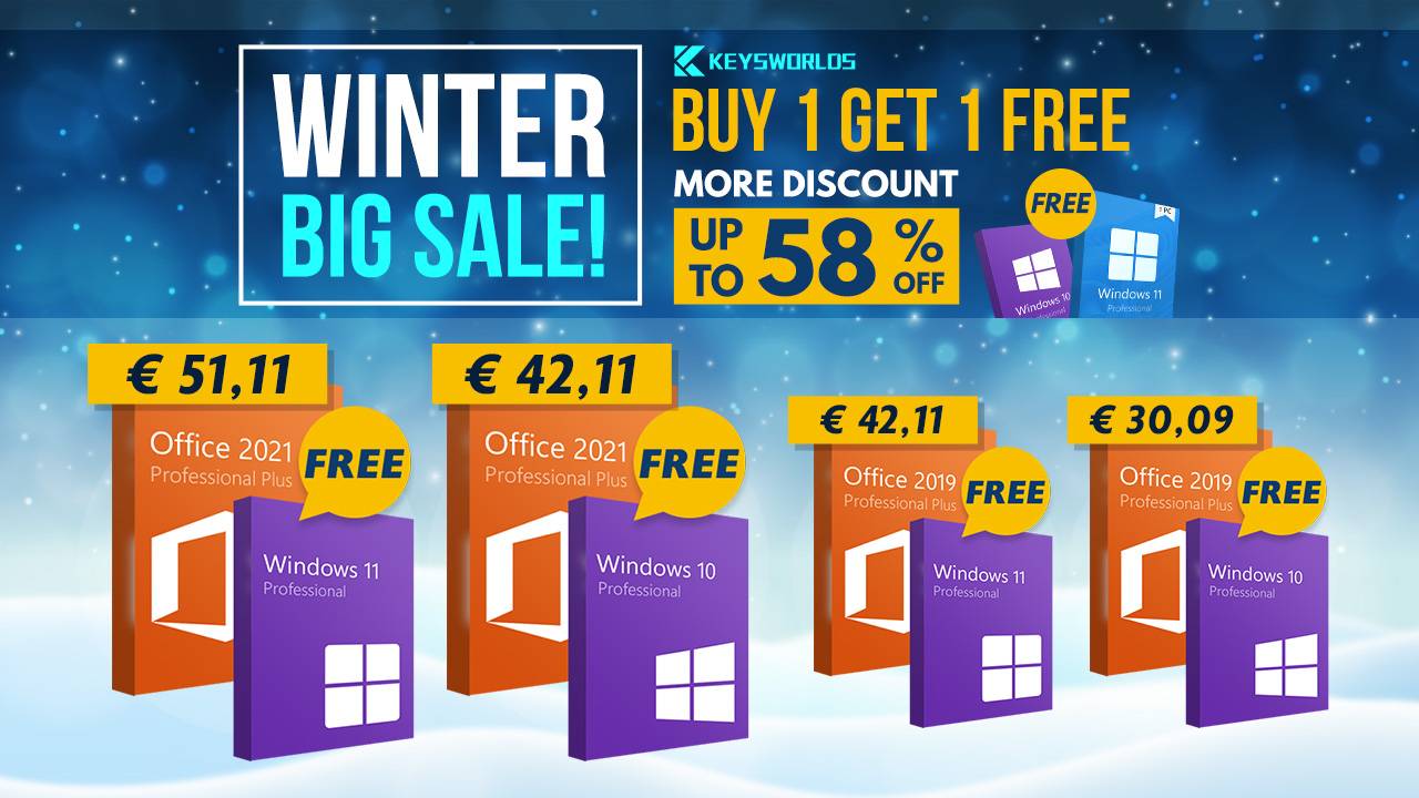 Η περίοδος των χειμερινών εκπτώσεων είναι μία από τις καλύτερες περιόδους για να πετύχετε μεγάλες προσφορές στα πιο δημοφιλή προϊόντα. Μία από τις καλύτερες προσφορές της χρονιάς υπάρχει στο Keysworlds.com! Ρίξτε μια ματιά στις προσφορές του MS Office και των Windows και θα συναντήσετε μια ποικιλία προσφορών για να επιλέξετε. Τα συγκεκριμένα offers περιλαμβάνουν MS Office στις πιο πρόσφατες εκδόσεις: MS Office 2021 Pro, Office 2019 και Windows 11 σε μειωμένες τιμές. Μπορείτε να αποκτήσετε μέχρι και Windows 11 και Windows 10 ως δώρο αν αγοράσετε Office από το Keysworlds με την προσφορά “Αποκτήστε 1 και λάβετε 1 δωρεάν“.