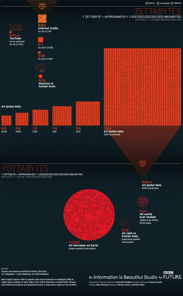 Ξέρατε, για παράδειγμα, πως μια κλασική «κασέτα» ήχου με διάρκεια 90 λεπτών περιέχει 0,7 MegaBytes δεδομένων; Ή πως το γονίδιο του DNA του κουνουπιού έχει μέγεθος 66 MB; Και υπάρχουν ακόμα πολλά, απίθανα, πράγματα που μπορούμε να μετρήσουμε τον «ψηφιακό» όγκο τους με τη βοήθεια της τεχνολογίας. Ένα ανθρώπινο ωάριο είναι έχει μέγεθος 0,76 GigaBytes (DNA)! Αντίστοιχα όλα τα έργα του Μότσαρτ σε μορφή mp3 έχουν μέγεθος 20 GB, ενώ 3 GB φωτογραφιών και βίντεο ανεβαίνουν στο Facebook κάθε…δευτερόλεπτο (με δεδομένα του 2012)!