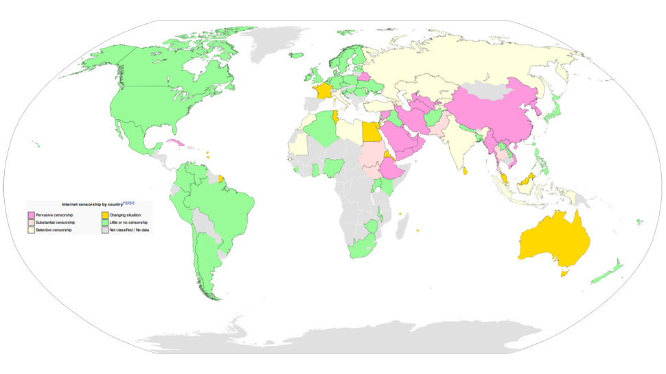 Υπάρχουν δύο «αλλά» σε αυτό τον χάρτη. Το πρώτο «αλλά» είναι το χρώμα του γκρίζου που αφορά χώρες στις οποίες δεν έχει καταγραφεί η παρέμβαση ρυθμιστών και αρχών πολιτικού ελέγχου στο διαδίκτυο. (Μεταξύ αυτών βρίσκεται και η Ελλάδα). Η λογοκρισία προσδιορίζεται από την πρωτοβουλία OpenNet, ως περιορισμός πρόσβασης σε ιστοσελίδες που ασχολούνται με τα ανθρώπινα δικαιώματα και την αντιπολίτευση στην κάθε κυβέρνηση, τον περιορισμό σε κοινωνικού περιεχομένου σελίδες, όπως το πορνό, στον περιορισμό ή την παρέμβαση διάφορων στρατιωτικών ομάδων με πρόσχημα την ασφάλεια, αλλά και τον περιορισμό με την χρήση διάφορων εργαλείων που παραδείγματος χάριν ελέγχουν και περιορίζουν την αποστολή και λήψη emails ή τις αναζητήσεις.