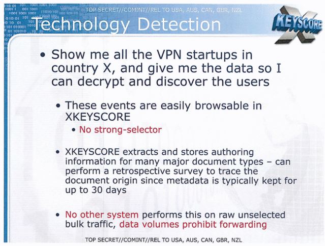Διαρρέουν σταδιακά οι λεπτομέρειες για τα μέσα που χρησιμοποιούν οι Αμερικανικές Υπηρεσίες Ασφαλείας, σε συνεργασία με υπηρεσίες ασφαλείας άλλων χωρών για να παρακολουθούν τις ηλεκτρονικές μας επικοινωνίες. Η Guardian αποκαλύπτει μία παρουσίαση του 2008 που εξηγεί το πρόγραμμα XKeyscore, το software και την όλη αρχιτεκτονική του συστήματος που επιτρέπει σε πράκτορες ή συνεργάτες της NSA, να δουν οτιδήποτε αφορά την δραστηριότητά μας στο διαδίκτυο. Emails, chats, ιστορικό περιήγησης, κλήσεις VoIP και άλλα.