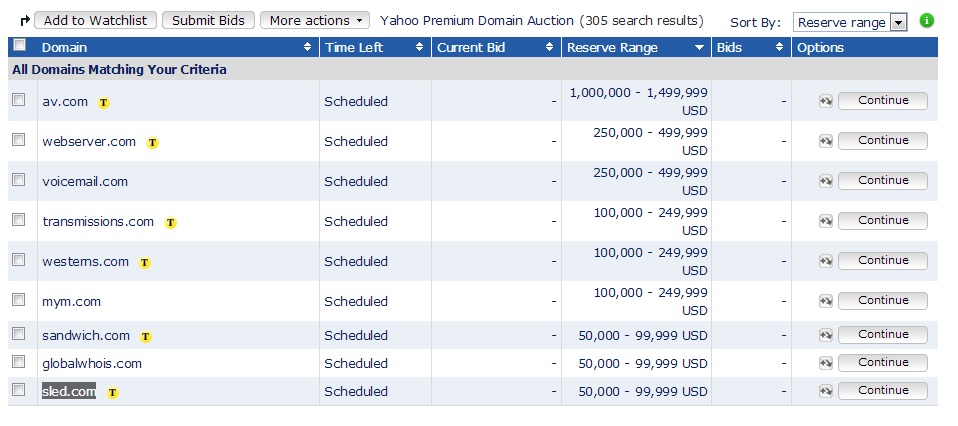 Αναμφίβολα το πιό σπάνιο, ποθητό και ακριβό domain είναι το www.av.com, που θα ξεκινήσει από τα 1.000.000 δολλάρια! Συνολικά 305 domain names είναι διαθέσιμα μέσω αυτής της δημοπρασίας της Yahoo, οπότε ρίχτε μια ματιά, μπορεί κάτι να σας ενδιαφέρει αρκετά για να δώσετε τη μάχη για την απόκτησή του.